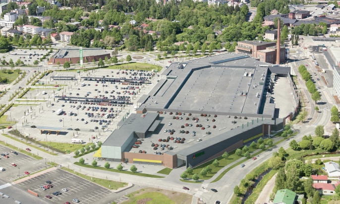 TOIMEKSIANTO: Supermarketin laajennusosan upottaminen asiakkaan ilmakuviin, kahdesta eri suunnasta tarkasteltuna.